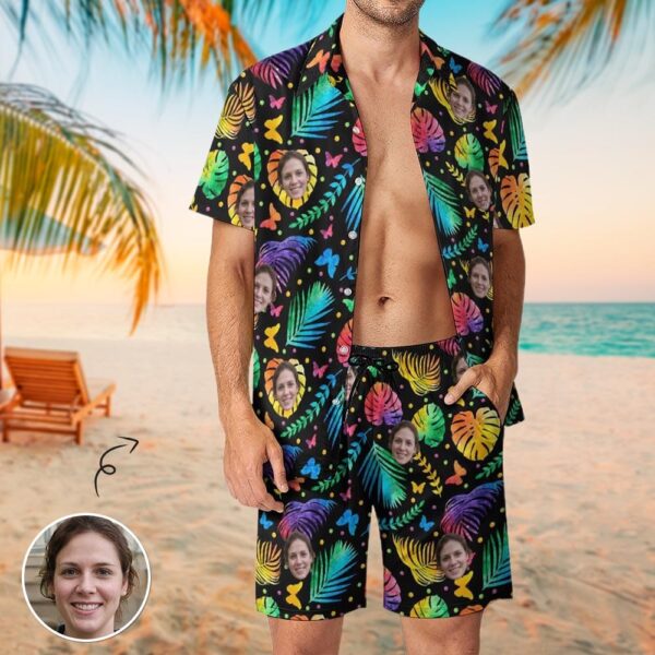 Custom Face Colorful Leaves Shirt Hawaiian Sets Personalized Pocket Hawaiian Shirt & Beach Shorts Casual Beach Outfit Suit