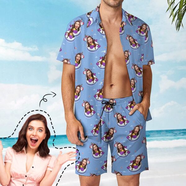 Custom Face Unicorn Pattern Shirt Hawaiian Sets Personalized Pocket Hawaiian Shirt & Beach Shorts Casual Beach Outfit Suit