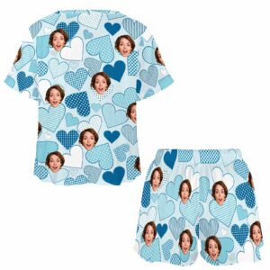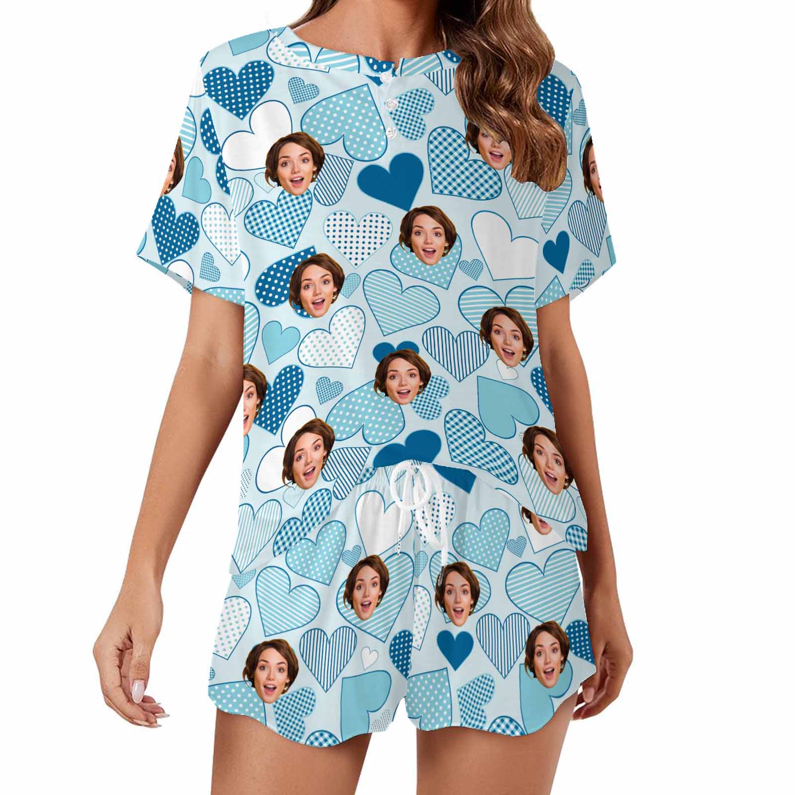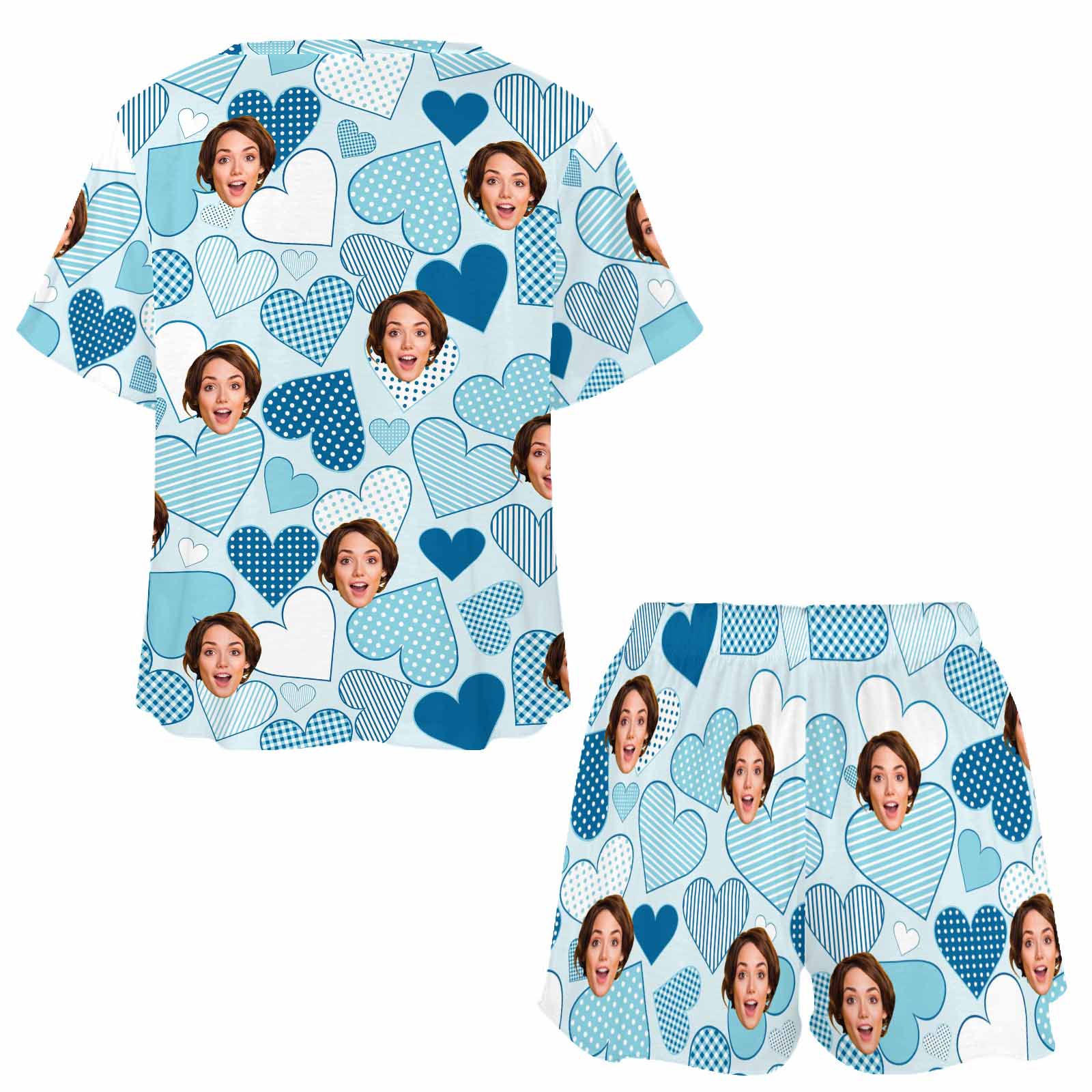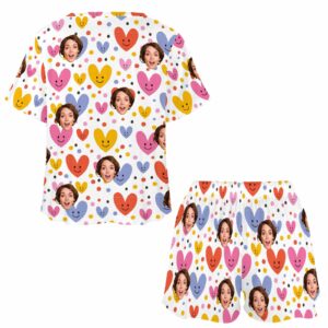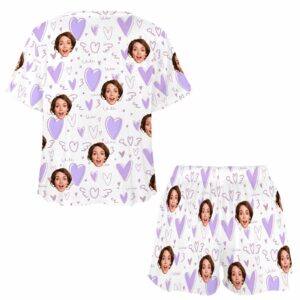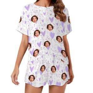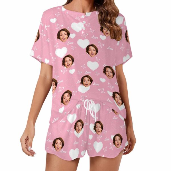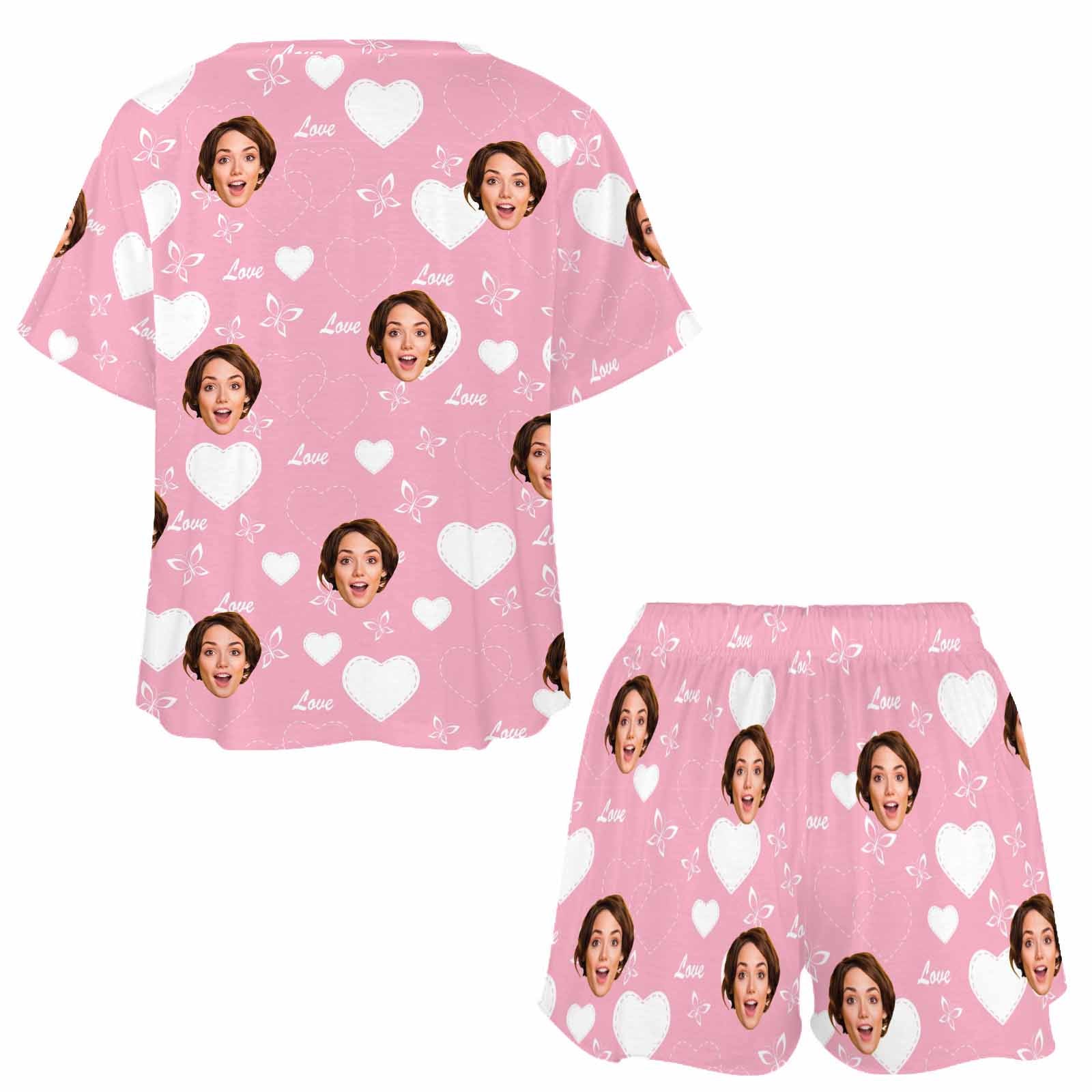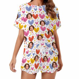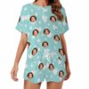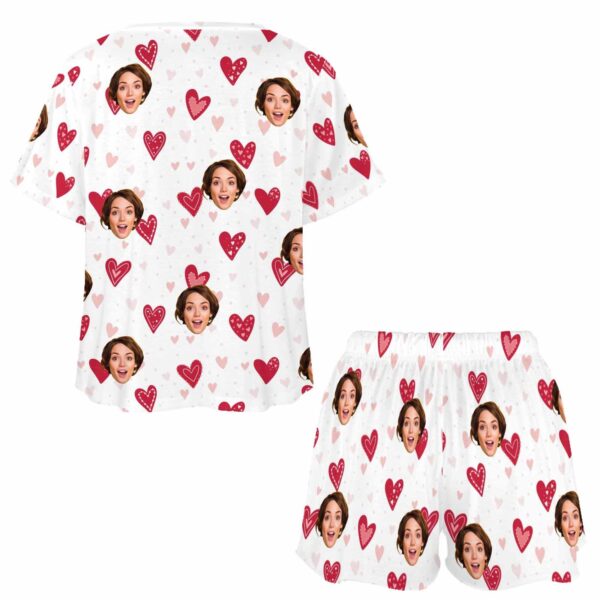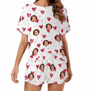 Custom womens Valentine Short 2 Pieces PJ Sets with Face Personalized Photo round neck Sleepwear for GF Wife Mom gift