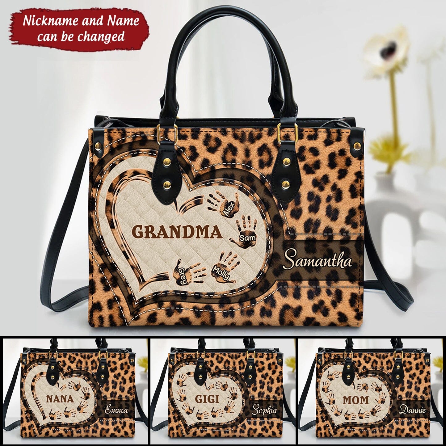 Customized Grandma Mom Heart Hand Prints Leopard Seamless Mothers Day Familia Gift Leather Handbag HLD01AUG22TT2